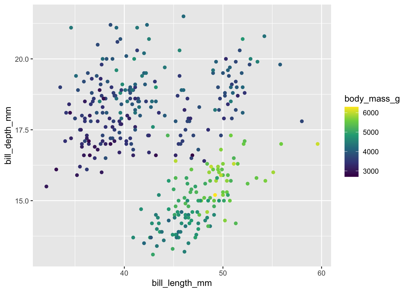 aes(x = bill_length_mm, y = bill_depth_mm, color = body_mass_g)