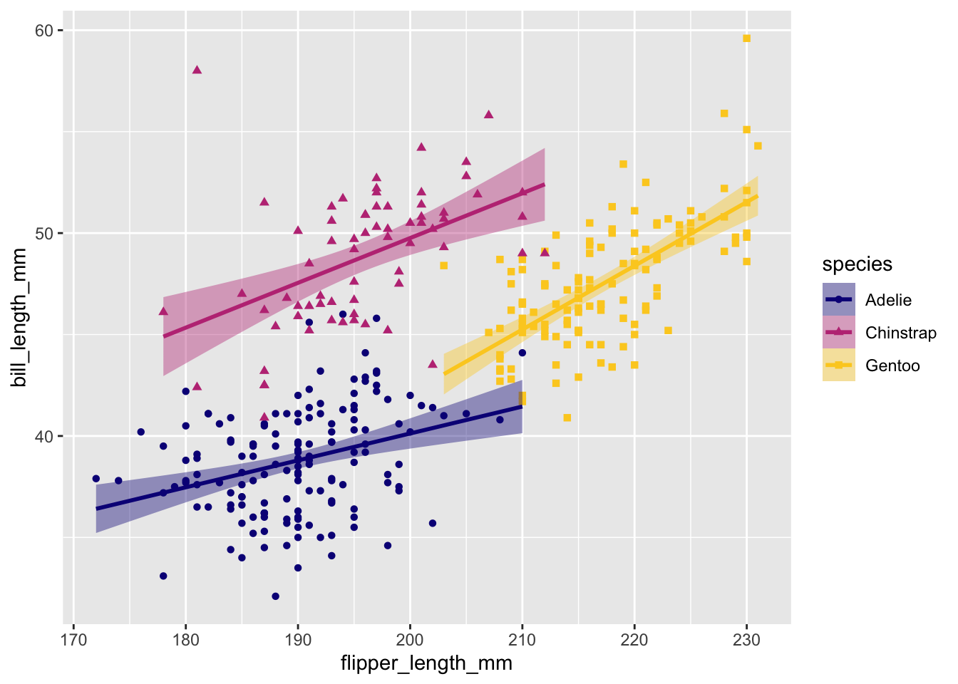 Our initial example plot uses just 3 colors, but we can still use viridis to ensure they are colorblind friendly and perceptually even using scale_color_viridis_d() for “discrete”. The colors still follow a gradient from cool to warm.