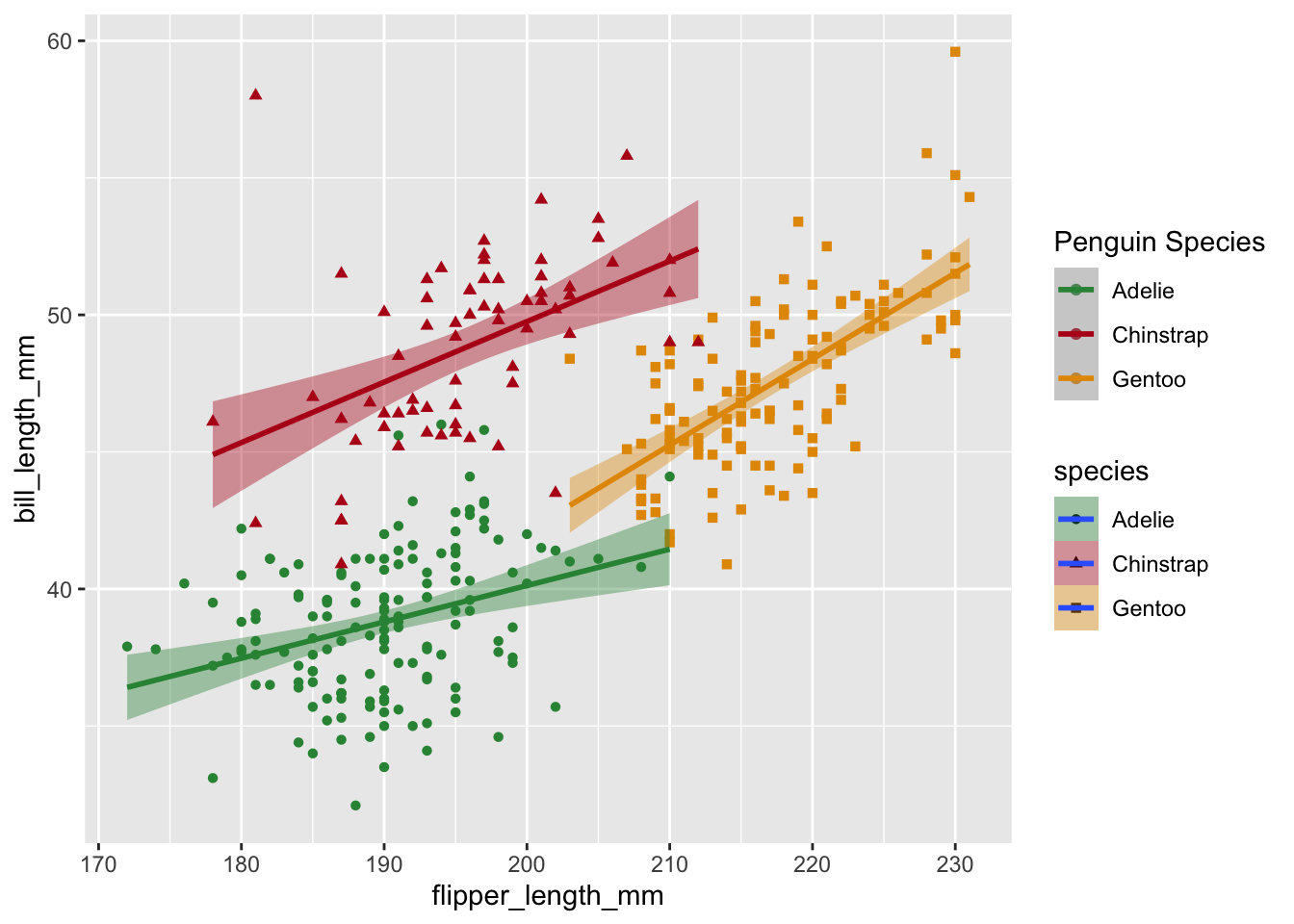 Each scale (color, fill, shape), including x and y axes, can have a label. There are multiple ways to set this, but I’ll demonstrate setting it with labs()