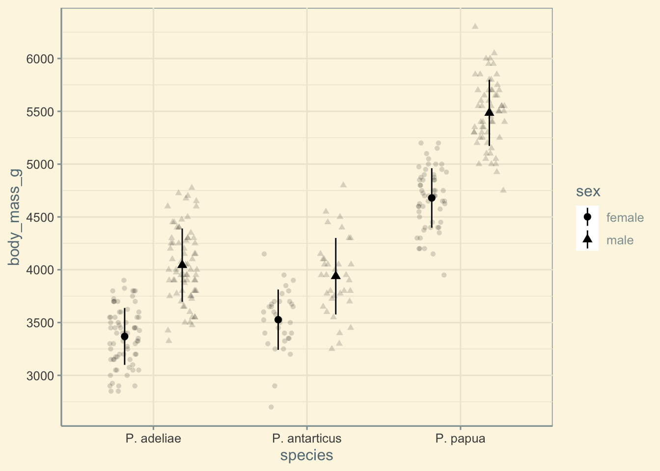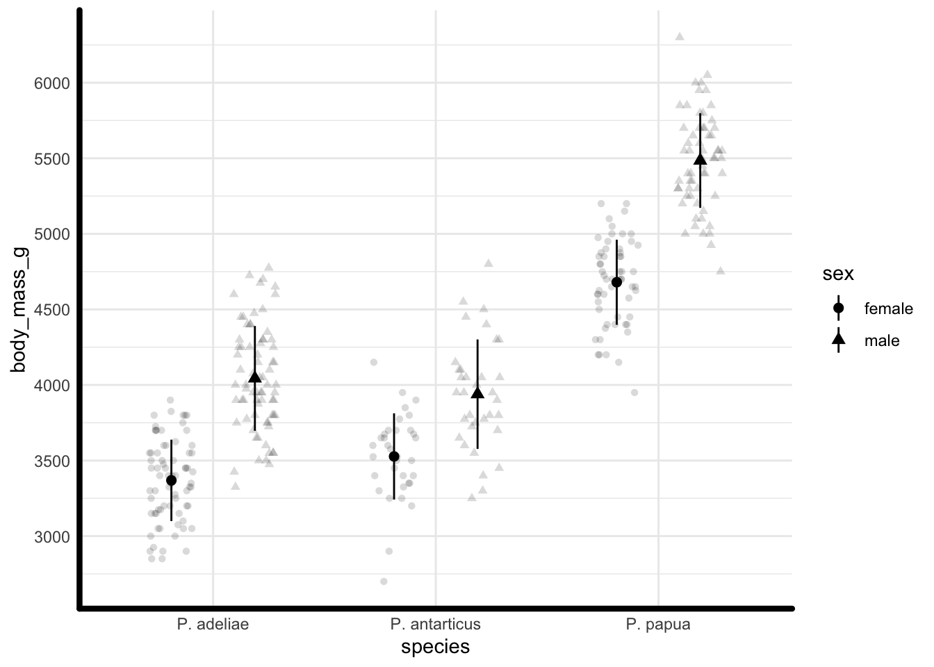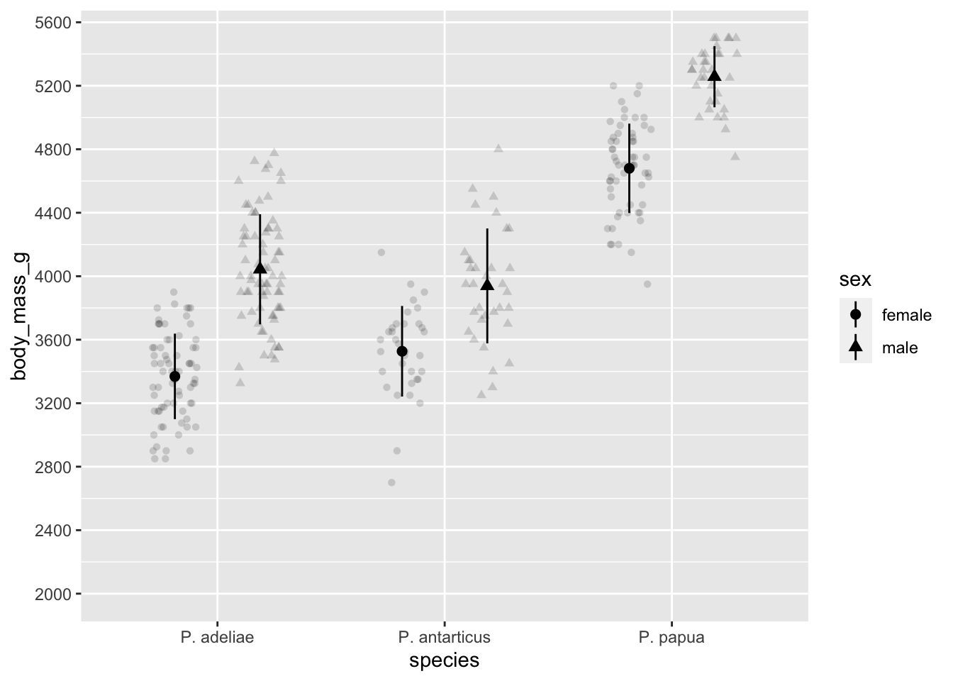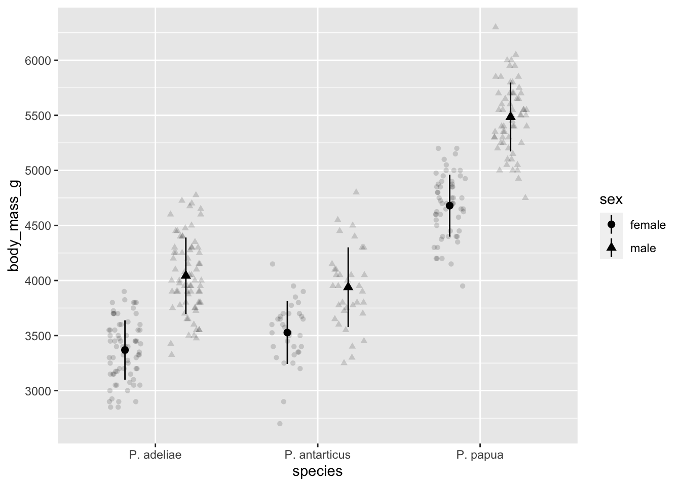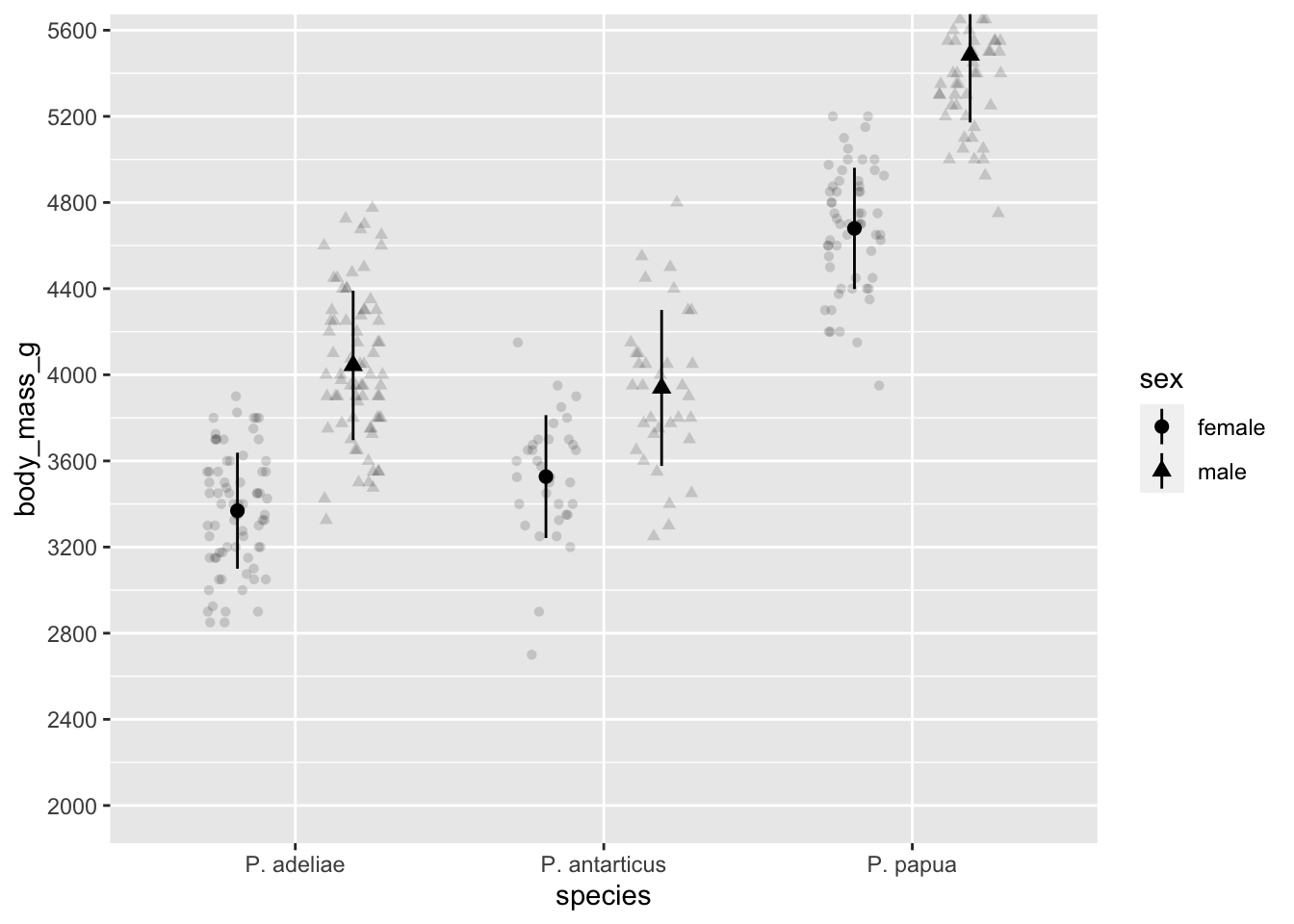 You can set the range of a axis two ways, and the choice of which way is consequential. Setting limits inside of scale_() crops the data while coord_cartesian() only crops the plotting area. With ylim(2000, 5500) the mean and standard error for our largest penguins are re-drawn using the cropped data while they are unaffected by coord_cartesian() (except that they go off the edge of the plotting area now)